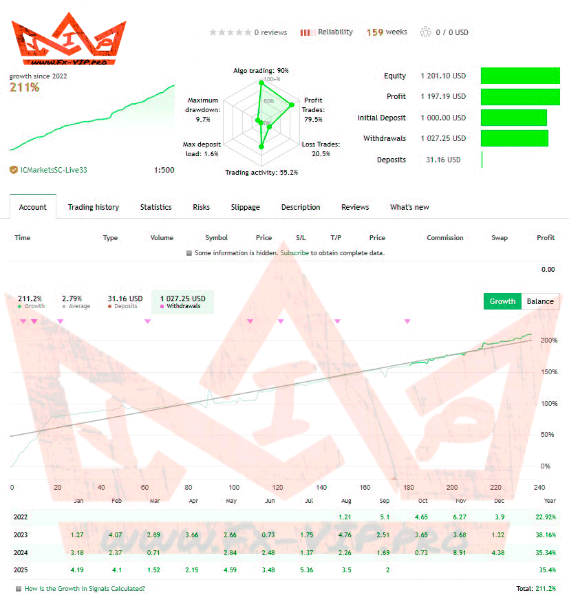 Backtesting was not conducted, as there is a live signal on the account from the author, detailed statistics below